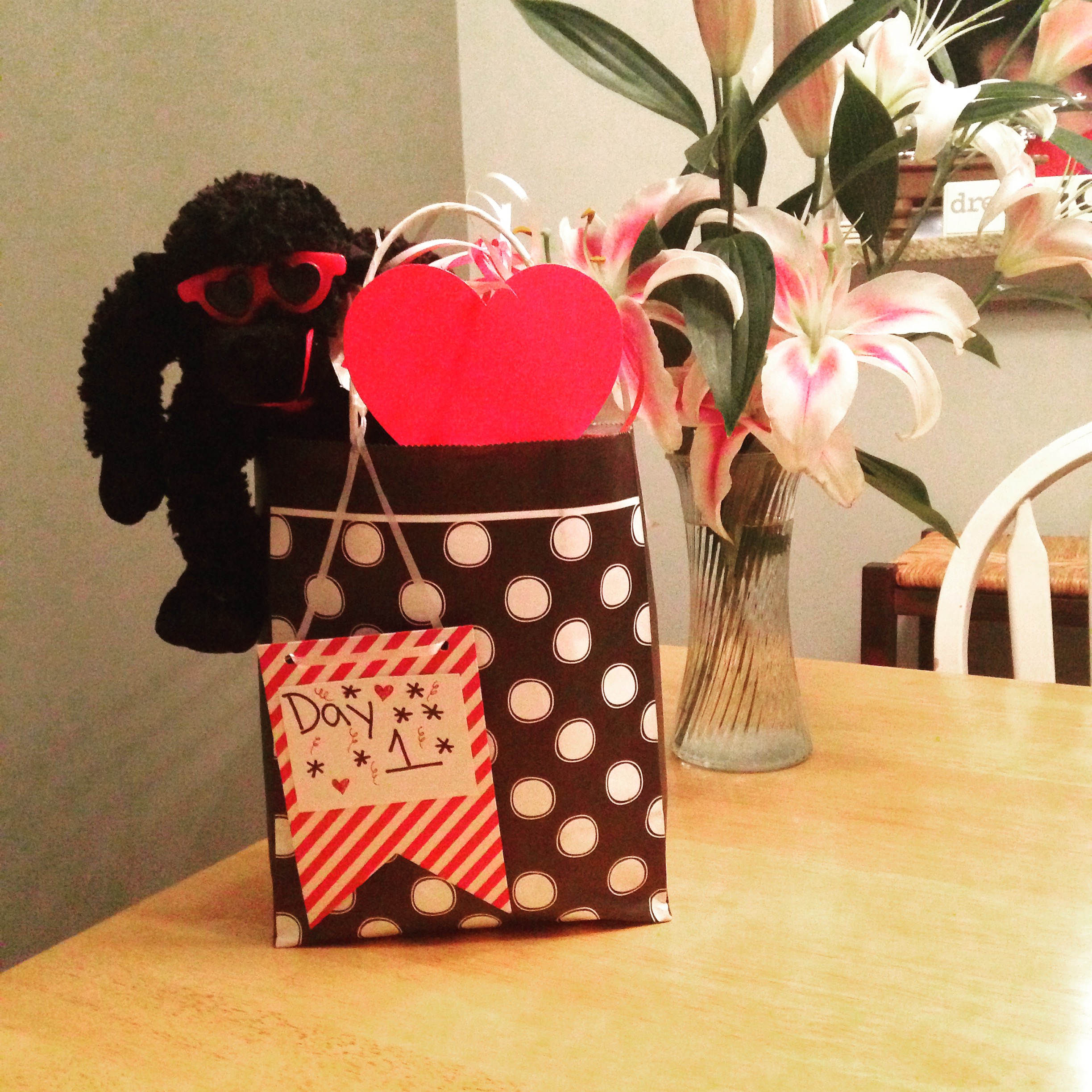Plan B drew me to one of my absolute favorite things about the world of blogging – people LOVE to celebrate. Holidays, birthdays, anniversaries, change of season, heck – a simple picnic lunch – I have witnessed with a little effort and a few sparkles – you can make ANYTHING feel like a celebration. So for starters I wanted both of us to just be in the festive mood. I wanted Danny to wake up every morning excited for what this week means and to know that I sending my love vibe all week long. So bring on 5 days of gifts that he would find each morning on the dining room table.