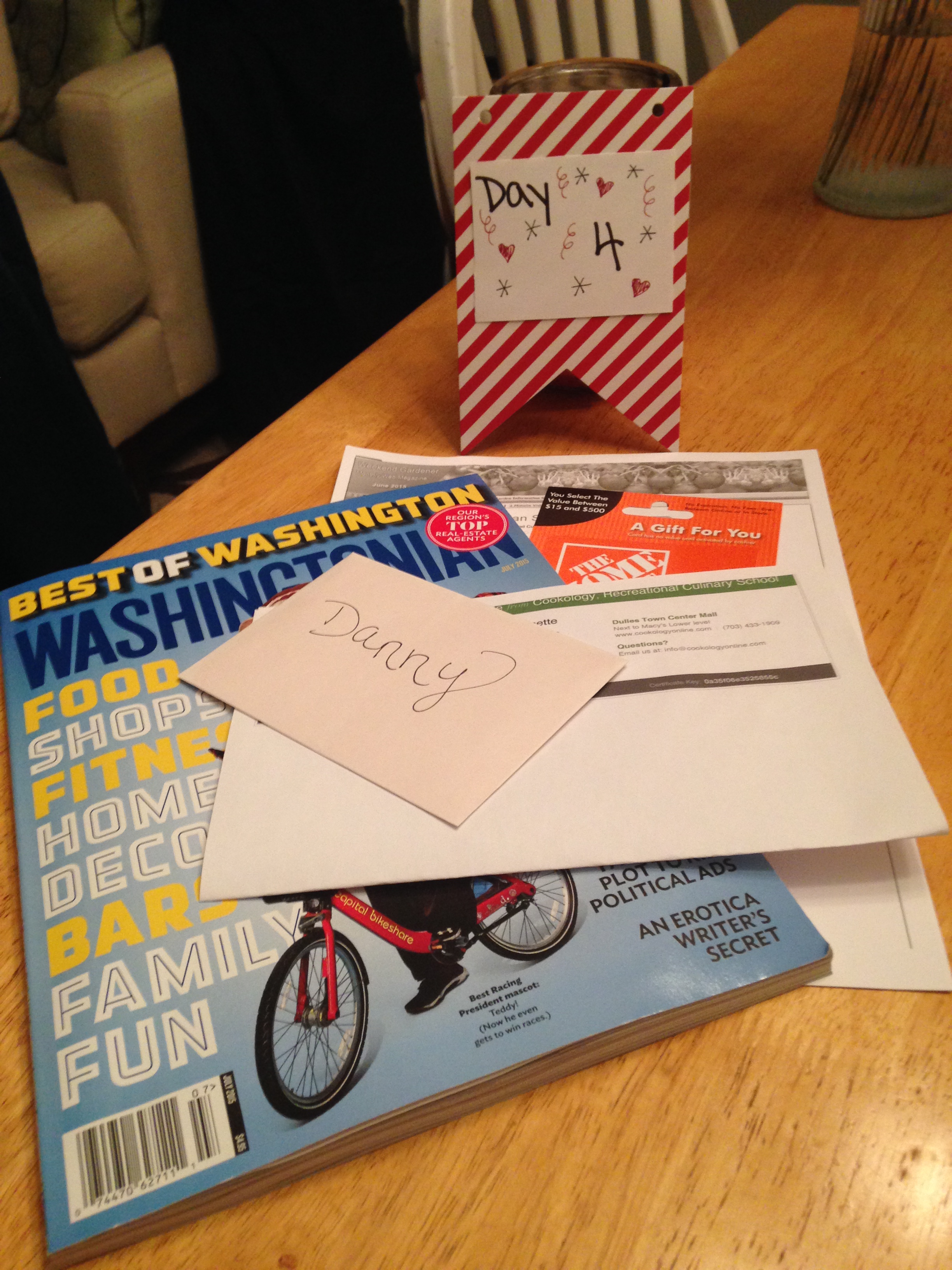 Day 4 – five years of marriage and ten years of dating are no reason to let the adventures stop, so day four I gave Danny a few gifts for some new adventures – cooking class, home depot gift card for some house projects, and the latest list of “Bests in DC”.