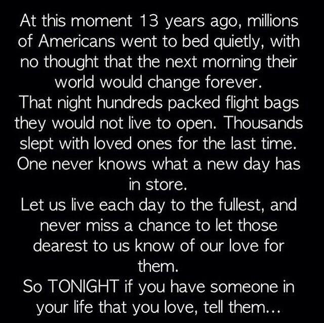 Last night I saw and re-posted this on Facebook – I found it to be incredibly moving. Everyday, all day long, throughout the world – people go through their days, never knowing what is around the corner. For most – just another moment in their life – but for others, it could be the end of life as they know it. Of course we all feel that truth so very strongly when it comes to 9/11 – but it is a reality everyday. This year as I drove around my neighborhood, seeing soccer practices gather, watching parents arrive home from work, people just living their lives I was again overwhelmed by the sheer beauty everyday life provides. Yet for many, there is a hole, there is a missing member of the family, a missing character in the story, a life no longer lived here on earth.