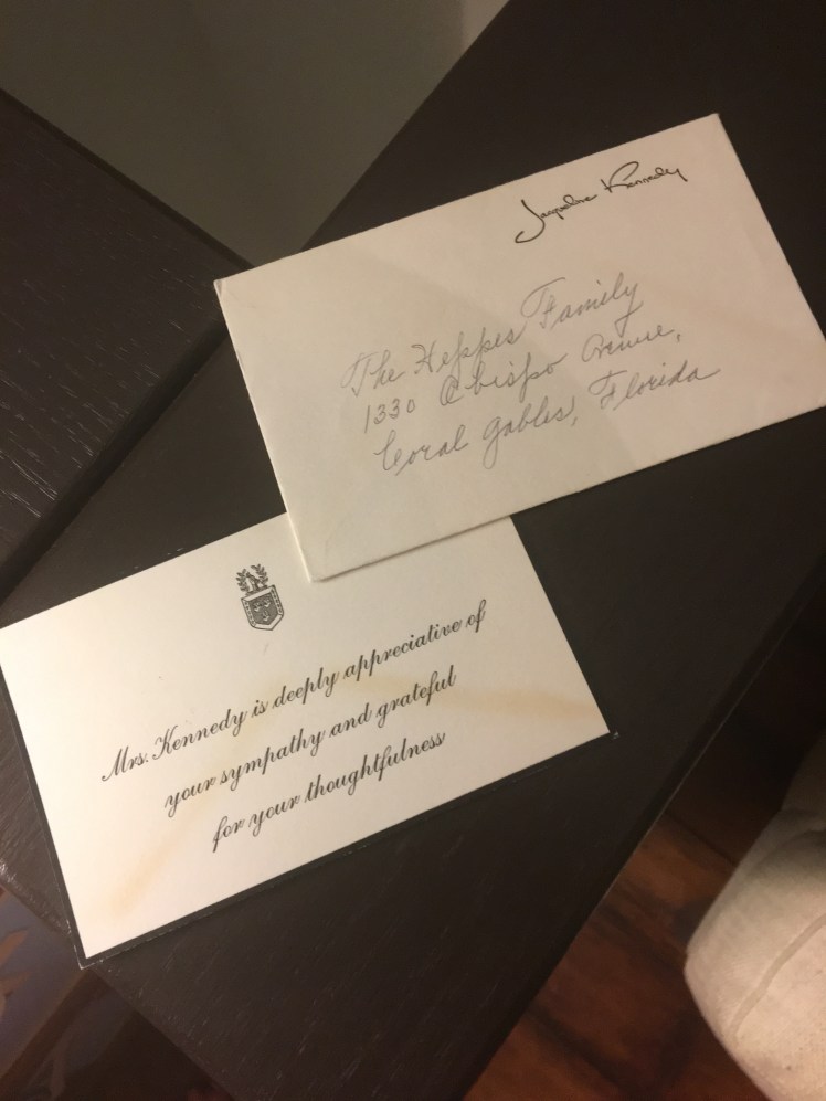 Over the years it has become one of our favorite shared interests. He has gifted to me many books on the family, shared his recollection of the day Kennedy was shot over and over again, as luck would have it we both went to Dallas together for work and spent the day touring the museums of Mr. & Mrs. Kennedy’s visit. And of course the most cherished token of this bond, he gave me the letter from my grandmother’s collection of prized items.