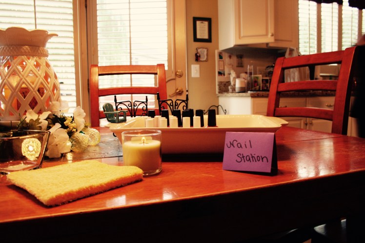 For the first attempt at this I wanted to keep it super simple – 3 treatment options and a nail painting station. But I still hoped it would feel special – even if my oatmeal hand treatment was a dud – so I also made little goodie bags with my favorite pampering tools (nail buffer, vaseline, wash cloth, hair band). Then the icing on the cake – Mom treated us to some new girly matching PJs and slippers and we were on our way!