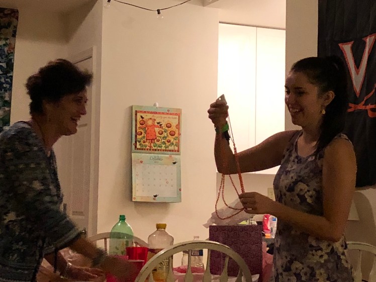 After a quick tour Mom gave us our treats – UVA colored accessories for the football game the next day. Sorry to admit to my Cavalier fans I don’t have a lot of blue and orange in my closet….. but thanks to Mom’s gift skills and Charming Charlies (LOVE THOSE STORES) we would be all set for day two!
