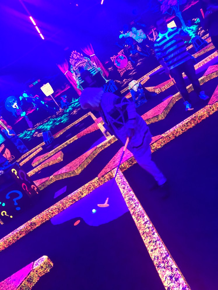 First up for the new activities was an evening of Monster Golf. You see Grant and Kelly our city family (they have been living in New York and just moved to Chicago this summer), always bring out the adventurous side. Instead of some of our tried and true activities (take out and cards), they did some searching around only to find indoor Monster Mini-Golf! Yup, we had a night of mini-golf that was glow and dark and included a great arcade.