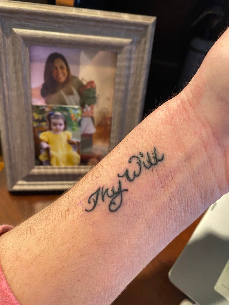 As the new year approached and my battle for the life I had wanted continued to shift, I heard the song “Thy Will” by Hillary Scott on it I found an incredible artistic display of the conversation I was having with God for months.. maybe years. I was in a place of “Thy Will” and on a journey to not just follow it… agree to it… but find comfort and peace in it. It was how I wanted to live my life – a life I no longer knew how to lead. I have given it to Him and the days I won’t hand it over I still have to say it. A message I had to learn to live with and wanted to for the rest of my life. I had my tattoo.